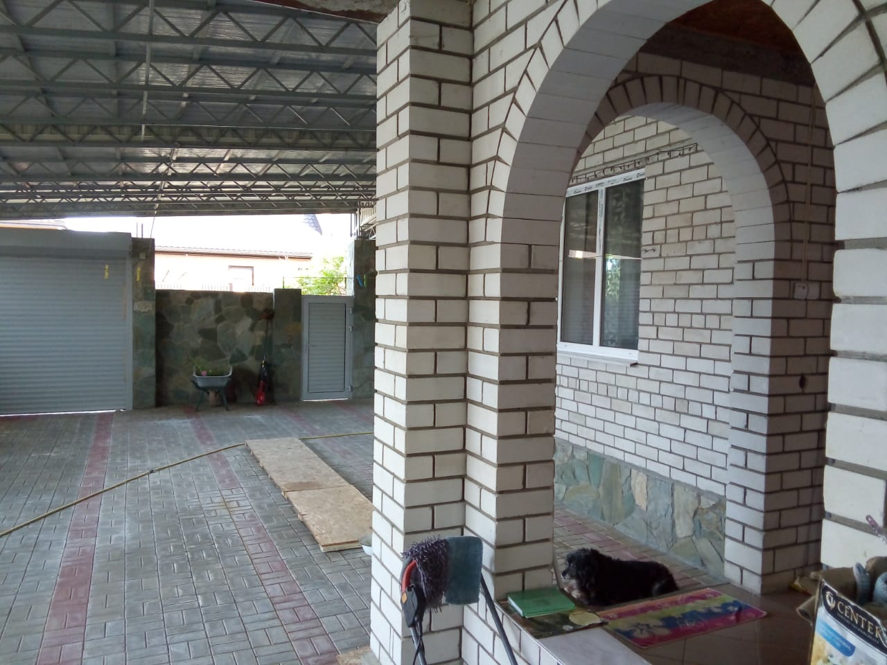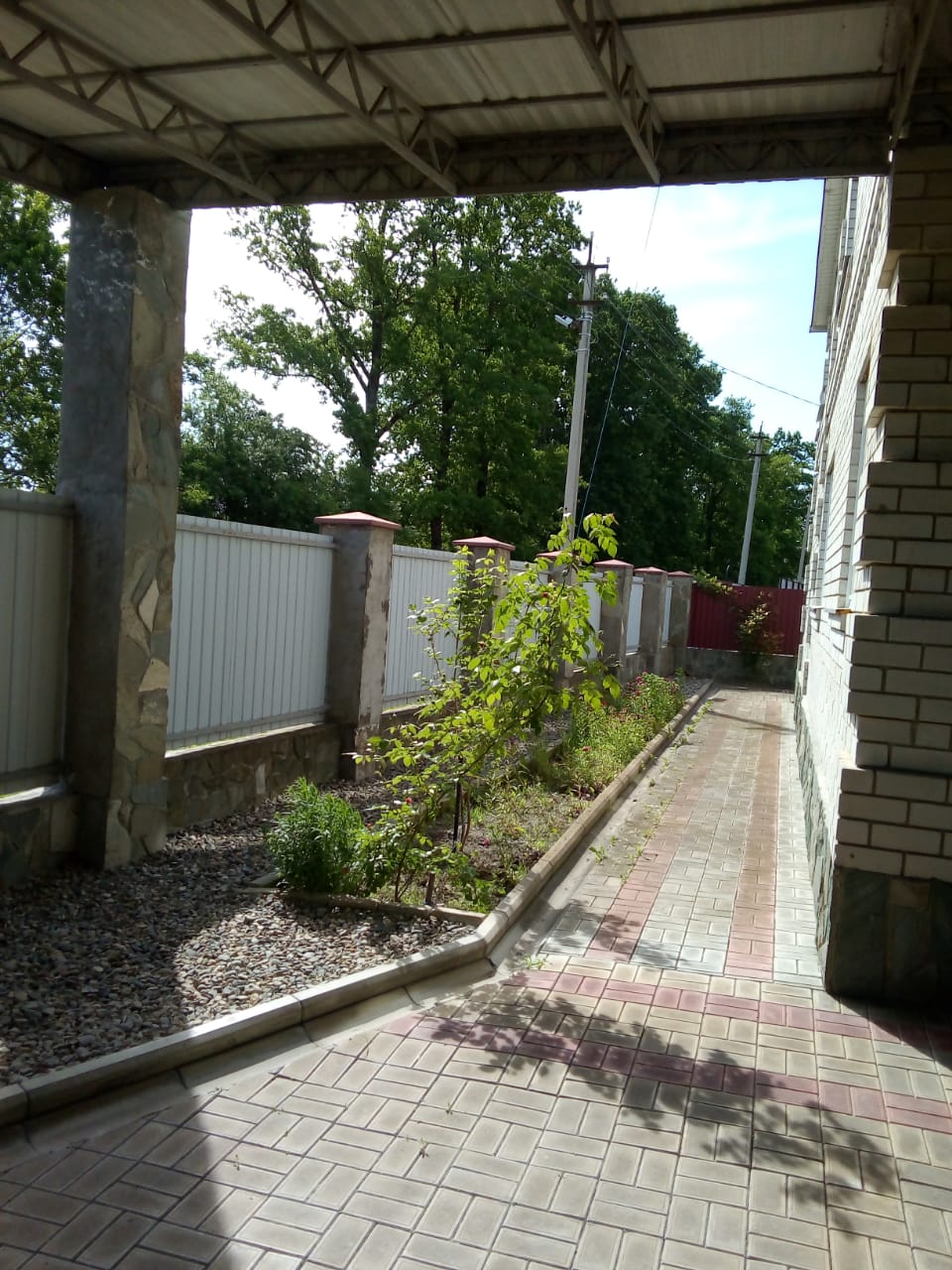 Во дворе общей площадью 130 кв.м., накрытом навесом из металлопрофиля, находится стоянка для 2-х автомобилей с электрическими воротами.
